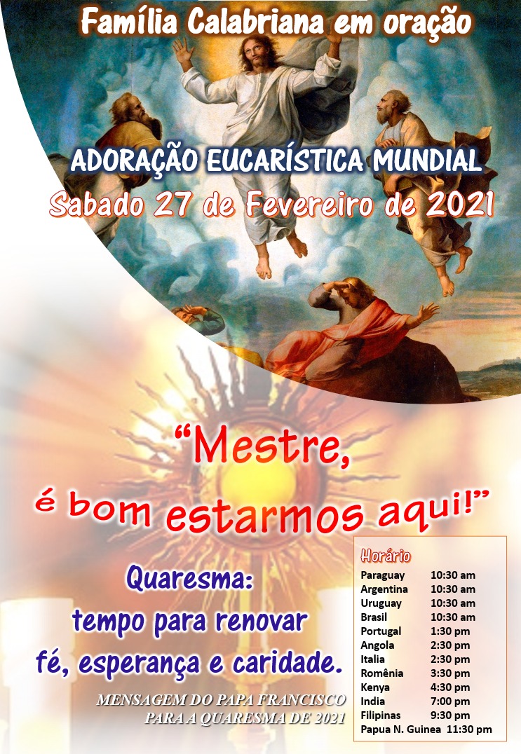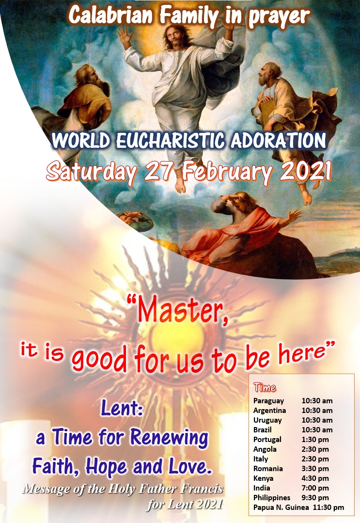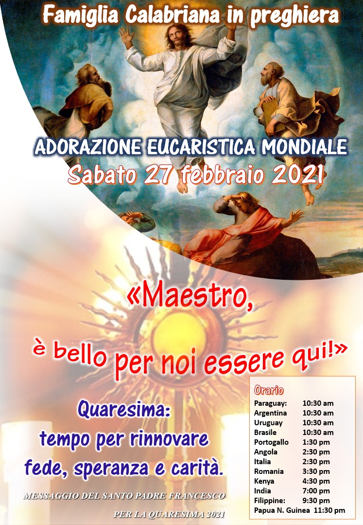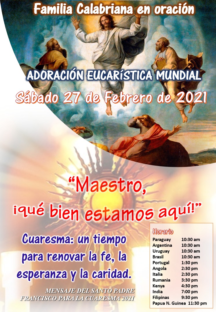 Dando continuità ai nostri appuntamenti di preghiera mensili per i capitoli generali, siamo invitati come famiglia calabriana a vivere un momento di adorazione e di preghiera nelle nostre case e nelle proprie famiglie questo prossimo sabato 27 febbraio.