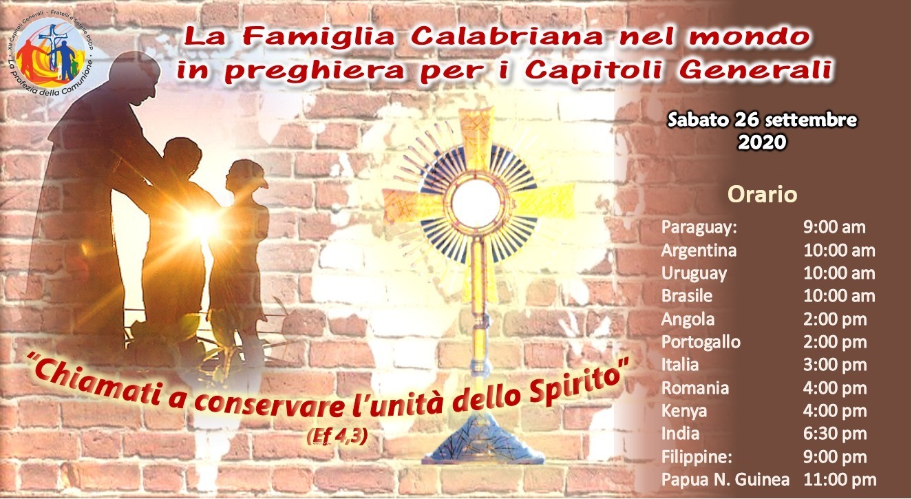 “Chiamati a conservare l’unità dello Spirito” (Ef 4,3) è stata l'iniziativa spirituale proposta dalla commissione formativa il 26 settembre, di vivere un momento di comunione e di preghiera di adorazione con tutta la Famiglia Calabriana presente nei diversi paesi del mondo.Questa iniziativa viene dopo il Rosario on-line di sabato 22 agosto.
